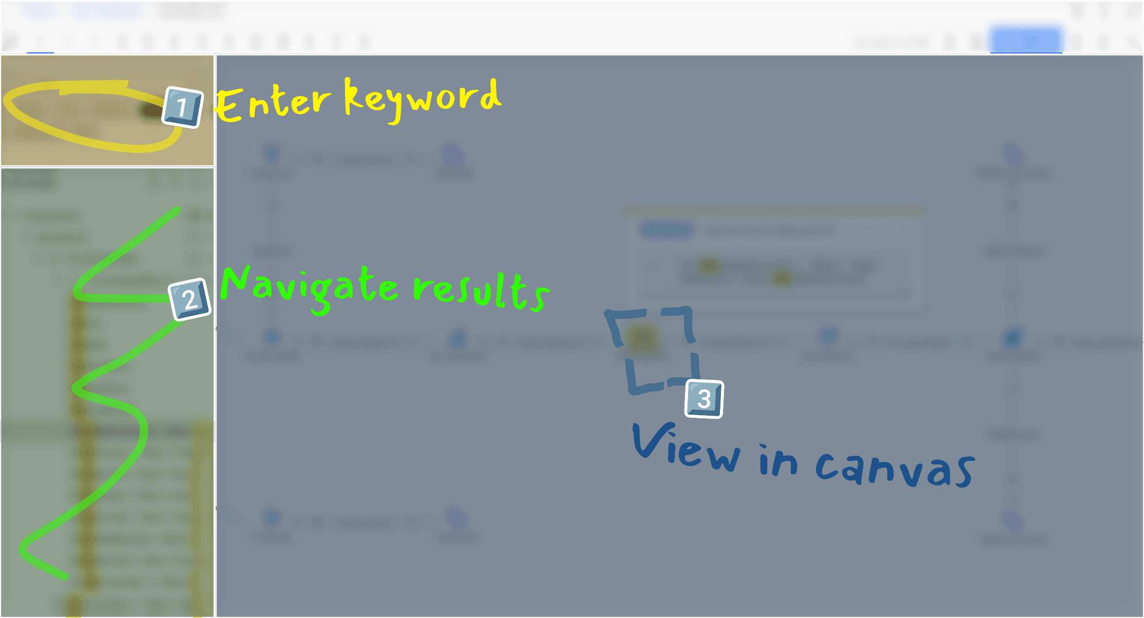 Users can jump from platform-level search directly into Canvas Find with context preserved